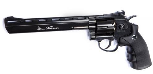 Dan Wesson 8″ Silver model CO2-powered revolver. This 6-shot revolver, which fires 4.5mm steel BBs, comes with 6 shells and speed loader.